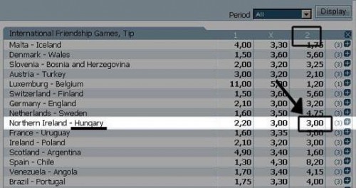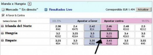 En la Betfair, la cotización de la apuesta Contra Hungría es 3.25. La diferencia esta un poco alta pero no se conseguió nada mejor.